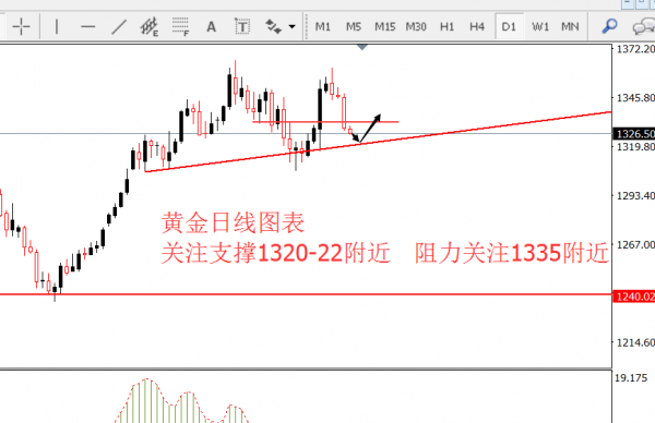 黄金短线弱势目前的肯定的不过1320-22附近也是关键支撑所以我们建议测试到可以尝试做多一次的机会,反抽阻力关注下1334-35附近的做空机会,短线内目前是区间走势所以维持震荡思路为佳。