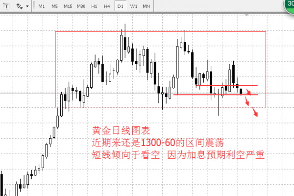 所以这个时候我们还是比较担心黄金会继续测试跌破到1300附近甚至更低的机会出现,所以我们建议最近一段时间周期在加息之前我们尽量的还是继续做空为主。不过这里也提示下若是直接下跌到1305-10附近的走势那么也要关注下区间支撑反抽的机会。
