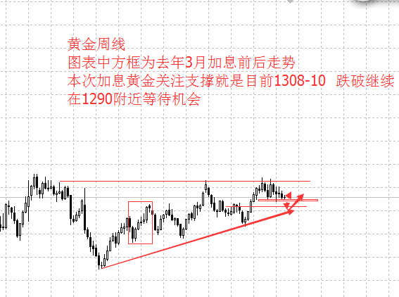 目前对于本次美联储利率决议是不知道其加息后会继续下跌还是说会买消息卖事实出现反抽上涨的,不过就观察到过年三月份美联储加息前后的走势自1260附近下跌到1200附近在加息后出现了一波强势的上涨行情的。所以我们不得不排除在加息后是不是会出现买消息卖事实的走势出现的。