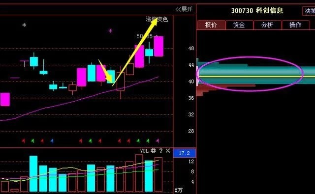 科创信息这只股票,是一只讲过多次的次新股,从图中来看,当时选出来的时候股价是在下跌的,但是我们来看筹码是集中有主力手中的,基本是在40块附近,而量能上也是上涨放量,下跌缩量,明显是主力吸筹,选出来之后股价就是三连阳,在第四天出现阴线回调,在这一天之前有讲过,明显洗盘动作,果然在周五再次涨停。有幸看了本人选股文章的朋友都是抓到了这只股票28个点的收益。