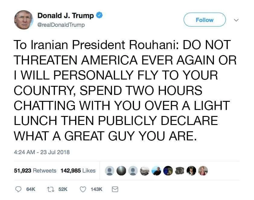 特朗普在针对鲁哈尼的推文写道:“永远不要再威胁美国,否则你们将遭受历史上从未有过的后果。我们不再是会支持你们疯狂暴力及死亡言辞的国家。小心点!”
