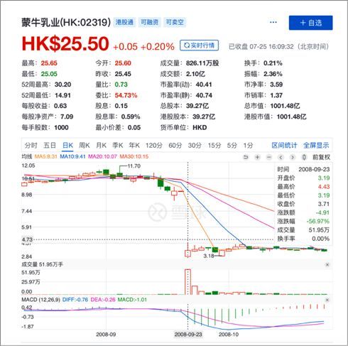 9月23日,蒙牛乳业的股票在港交所复牌当天暴跌60%。