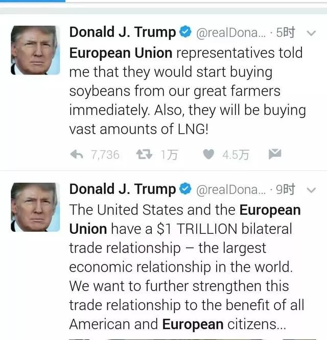 特朗普对外称,今天是“自由和公平贸易的大日子”,美欧关系将进入新阶段。会谈之前,特朗普更是在推特上频频发声,呼吁双方“取消所有关税、贸易壁垒和补贴”。欧盟委员会主席容克也在公开场合释放善意。