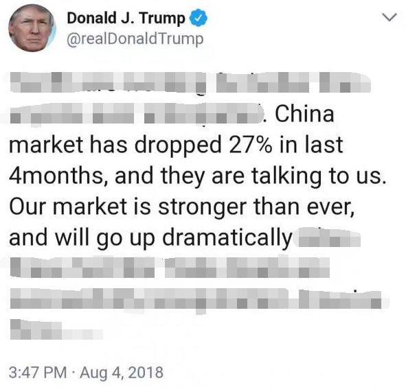 8月4日,没想到美国总统特朗普还特地关心了一下咱们的A股,他发了一条推特,其中部分内容我想了想还是给打了马赛克。中间那几句话的意思是中国市场过去4个月跌了27%,而我们美国股市一路向上。