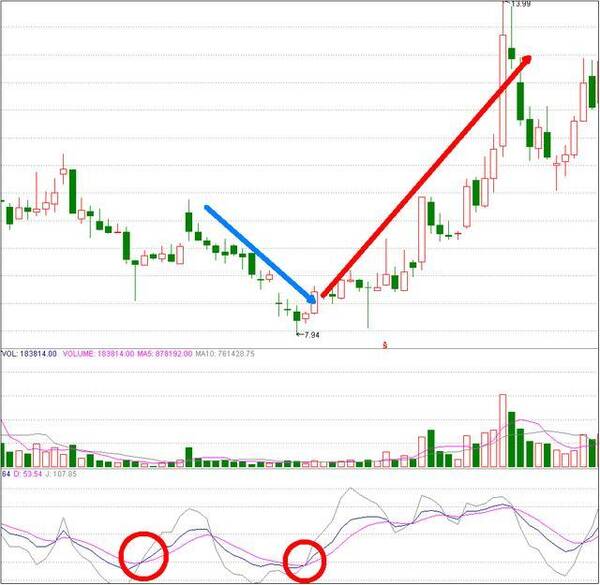 图中所示,KDJ指标第一次金叉的时候,股价并没有上涨,指标涨了几天之后就开始出现回落,并且在二次探底之后形成第二次金叉,直到第二次指标金叉完成股价才出现了一波超过70%的涨幅。而这在我们上面案例中所讲到第一次KDJ指标金叉后股价就上涨的幅度完全不一样,也就是第一次指标金叉出现,股价虽上涨,但涨幅也并不大,更可况更多情况下是股价并没有因此上涨,而是继续做二次探底、甚至是多次探底后才完成一轮确定性的上涨行情,我们俗称为“多重底”。