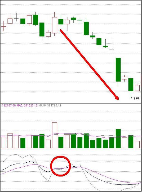 所以我们在运用无论是指标的还是均线的金叉和死叉来判断进场与离场时机的时候,一般金叉要等至少二次金叉出现,但死叉最好是第一个出现的时候就动手卖出。因为二次顶不过是给大家再一次出逃的机会,如果你反而把它视作是跟进机会的话,那就大错特错了。所以,第一次死叉就马上跑其实是对的,这是与底部出现第一次金叉时候的策略是有所不同的。我们再举个例子,看下图: