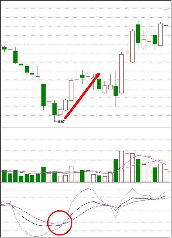 那么,指标在低位产生金叉,指数或股价就一定会上涨吗?其实也不是绝对的,上面低位金叉上涨的例子是一种可能,还有另一种可能就是即便出现低位金叉也未必会上涨,反而在底部会出现指标和股价的二次探底、三次探底等等。而从指标的稳定程度和准确程度来说,至少要等到二次探底动手才更可靠,也就是底部有过二次确认之后,这种上涨趋势建立的可信度更高。与此同时,在指标二次见底,二次金叉的时候,也要关注当时成交量的情况,“有放量、则上涨,无放量、恐再跌”,底部构筑需要过程,做三重底、四重底也是有可能的。如下图: