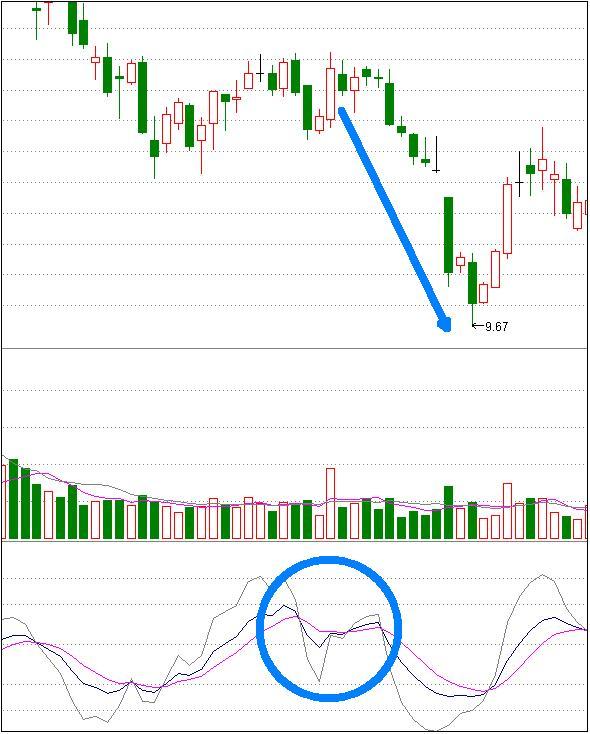 KDJ指标第一次死叉,股价并没有怎么跌,反而还出现三连阳,并且创了股价新高,大有力挽狂澜之势。但是,这三根阳线对应的成交量水平并不大,甚至在第三根阳线出现的时候有明显的高位“放量滞涨”的走势。随后便是KDJ指标回落途中的似乎要调整失败之势,这个时候主力的做盘手法、或者说诱多实在是太狡猾,一不留神我们就会成为再度追涨的“炮灰”。但是,当二次死叉出现的时候,股价的表现也就没有那么犹豫了,“飞流直下三千尺”,可能说的就是这种走势吧。