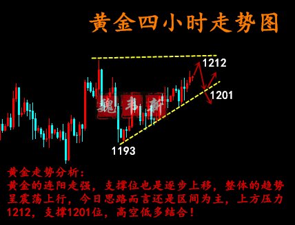 几个交易日的震荡反弹,虽然是不断的走强,但是并不能直接确立底部反转。所以魏韦新老师的思路,连续震荡慢涨反弹的一周,要防止周五收尾出现下挫!早盘慢涨是主要力度,欧美盘出现高点,晚间无延续,多头也并没有表示的过于强势,在这种情况下多空两方都难以抉择。回顾昨晚,午夜黄金二次回落在1203,今日早盘开盘直接急涨冲高至1210一线,也是触及前两日重点强调的高位1210-1212区间压力位!