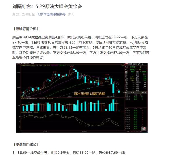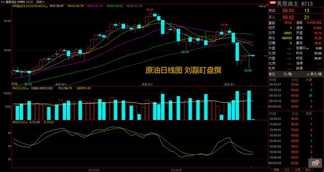 原油昨天的数据跟我昨天写的两篇文章一样,稍后我这边把截图拿出来看看,我们从日线上来看,下方的kdj指标有拐头形成金叉的趋势,目前的原油的压力还是在59.10一线,如果企稳上方的压力在60.00一线,下方的支撑在58.11一线,虽然ma5日均线与10日均线形成死叉向下发散,这些指标都是为更好的研究k线都是相辅相成的,不看单一指标做出决定,这样不是很明智,四小时来看,下方kdj指标形成金叉向上发散,下方的支撑在58.80一线,上方的压力在59.40一线,ma5日均线与10日均线形成金叉向上发散,下面我们简单看看今日操作建议
