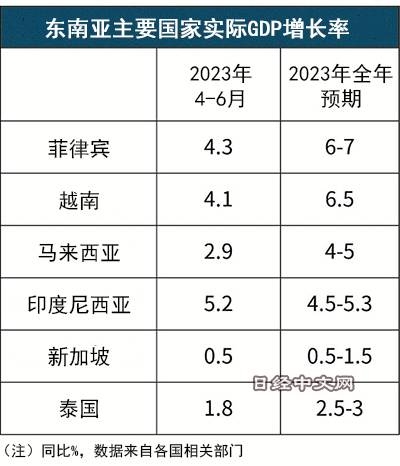 东南亚经济表现低迷。泰国8月21日发布的2023年4~6月实际国内生产总值(GDP)同比增长1.8%,低于市场预期(增长3%)。由于中国经济放缓等原因,外需增长停滞。其他东南亚主要国家也是如此,新加坡下调了2023年全年的预测。