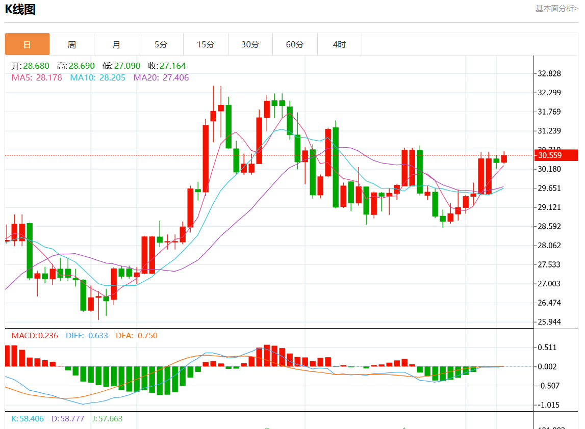 周五欧市盘中,现货白银报30.580,涨幅0.69%。