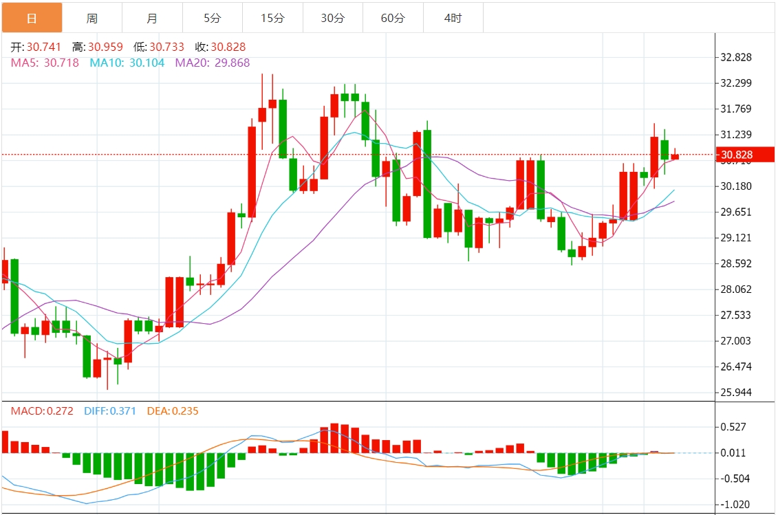今天的预期交易区间在 30.60 美元支撑位和 31.50 美元阻力位之间。