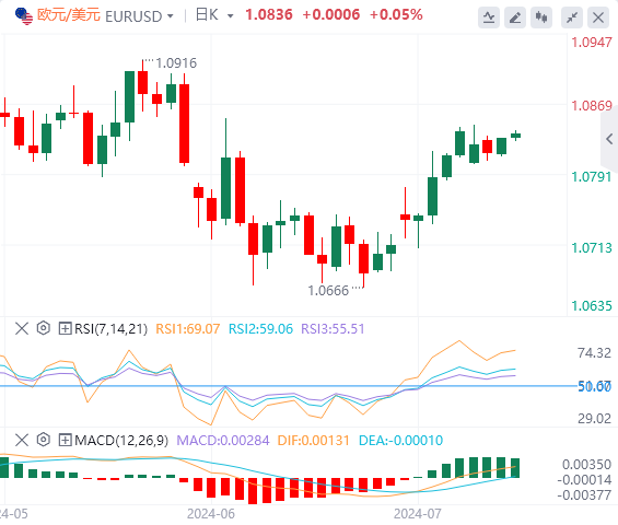欧元/美元继续在1.08上方交易。如果美元指数走低,欧元/美元可能会在近期内涨向1.0870/1.09,然后暂停升势。