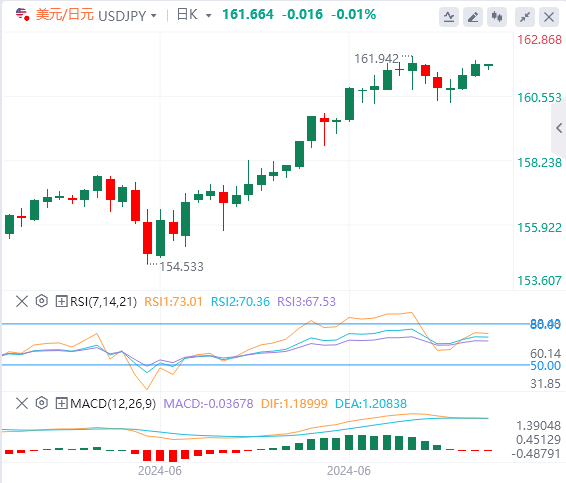 美元/日元在我们的目标位162下方徘徊,中期来看,美元/日元需要突破162,才能向164前进。