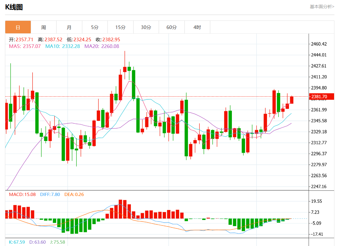 周四欧市盘中,现货黄金报2381.91,涨幅0.46%。