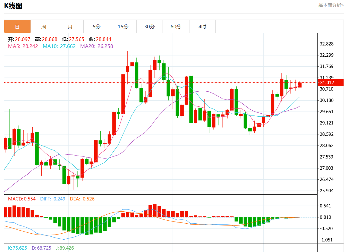周四欧市盘中,现货白银报30.970,涨幅0.58%。