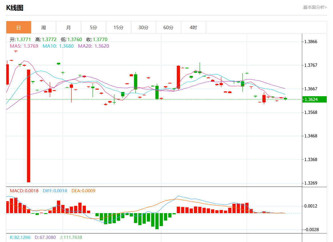 周五盘中,美元/加元报1.3625,跌幅0.04%.