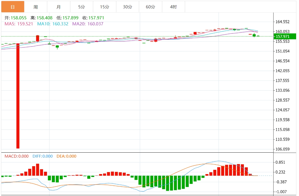 今天的预期交易区间在156.95支撑位和158.70阻力位之间