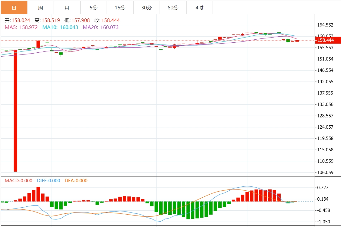 今天的预期交易区间在158.00支撑位和159.50阻力位之间