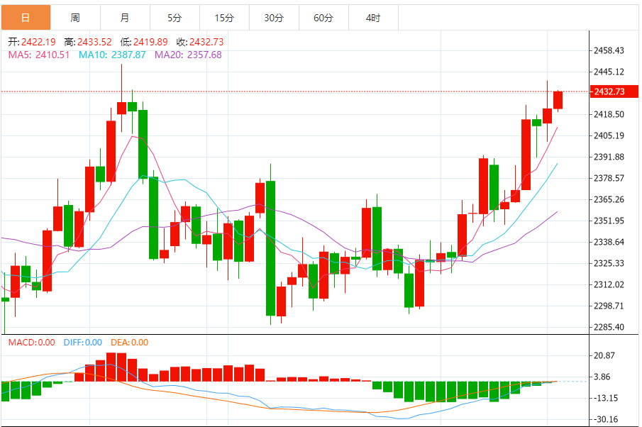 今天的预期交易区间:在2415.00美元支撑位和2450.00美元阻力位之间。
