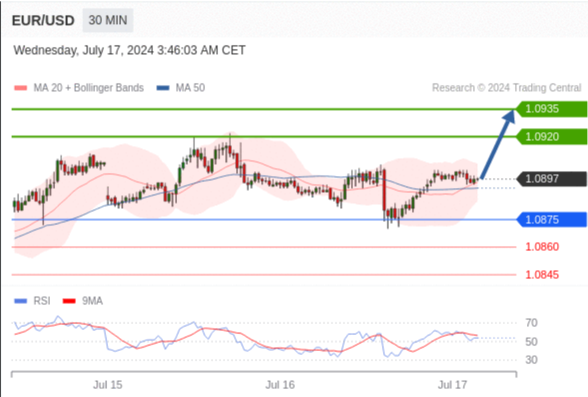 在 1.0875 之上,看涨,目标价位为 1.0920 ,然后为 1.0935 。