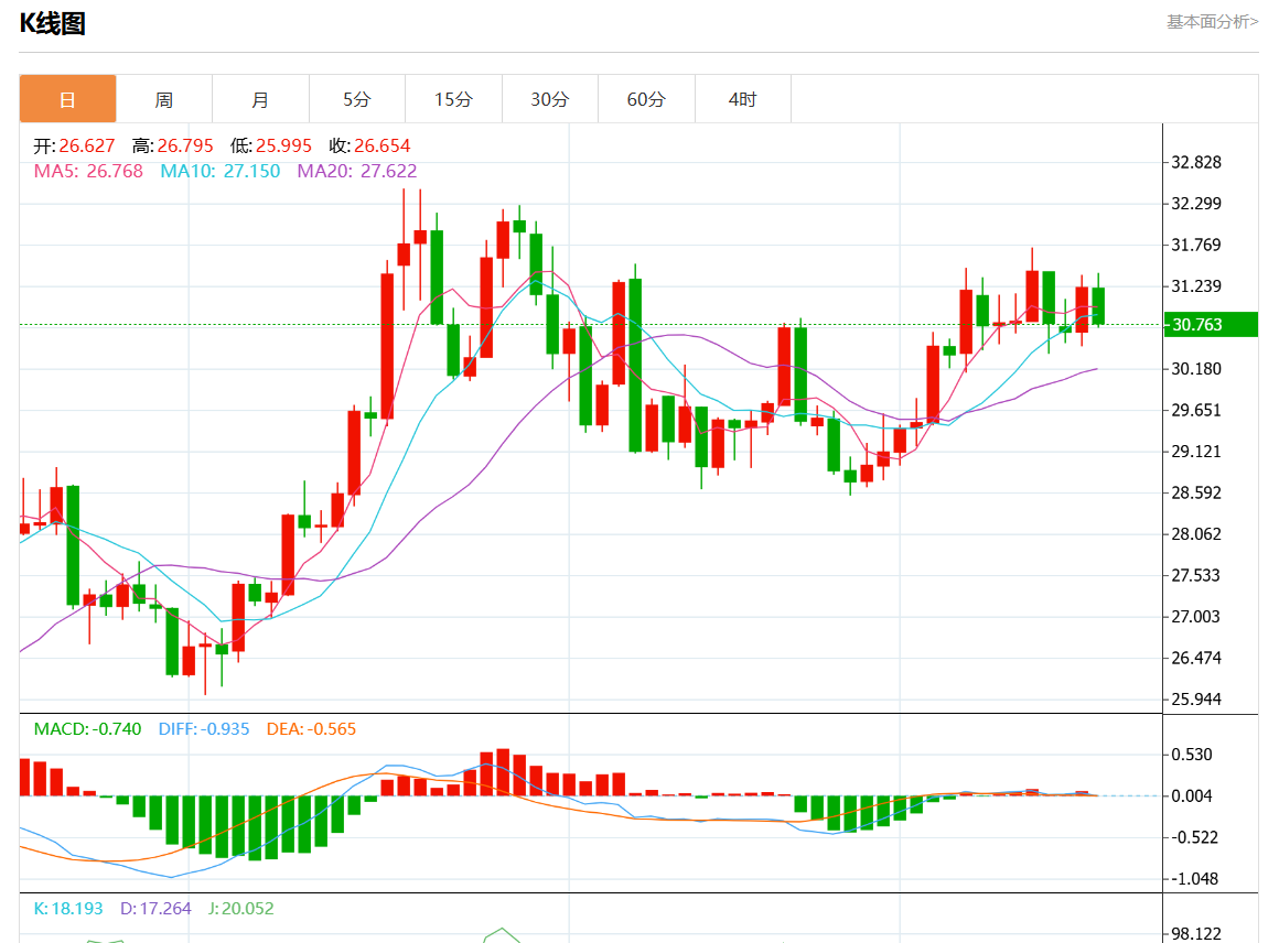 周三欧市盘中,现货白银报30.940,跌幅0.93%。