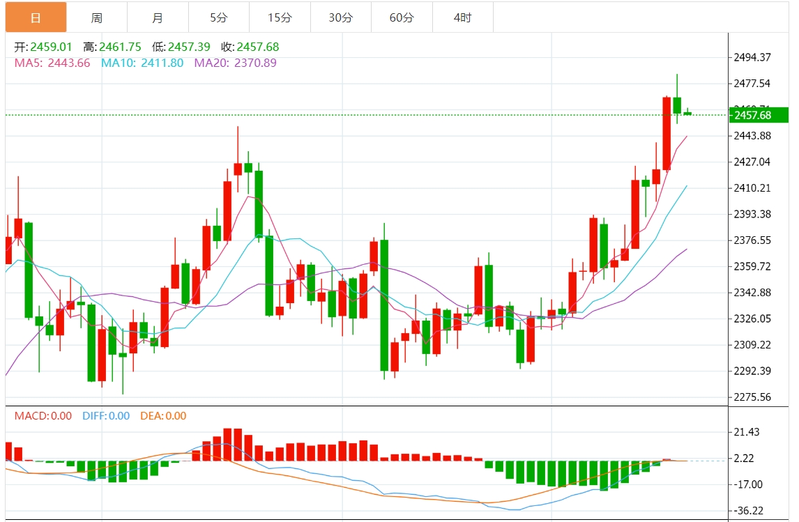 今日金价交投将于支撑位2450.00美元/盎司以及阻力位2490.00美元/盎司之间。