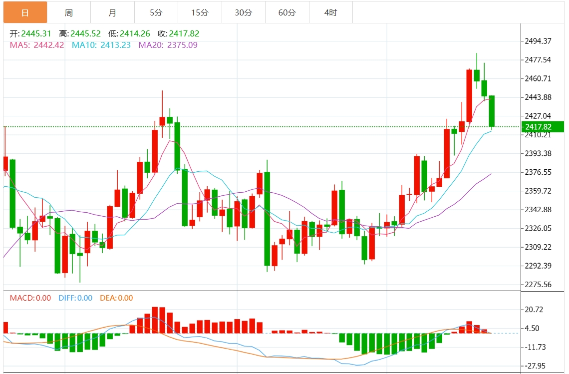 金价连续第二日面临温和的抛售压力,但几乎没有从纪录高位回撤。 日线图技术指标远未表明会出现阶梯式下跌,因为指标勉强从超买区域回撤,同时缺乏明确的方向性动能。 同时,金价维持在看涨移动均线上方,20简单移动均线(SMA)在2370美元附近构成动态支撑。