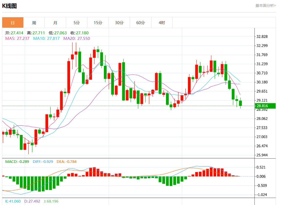 周二欧市盘中,现货白银报28.970,跌幅0.48%。