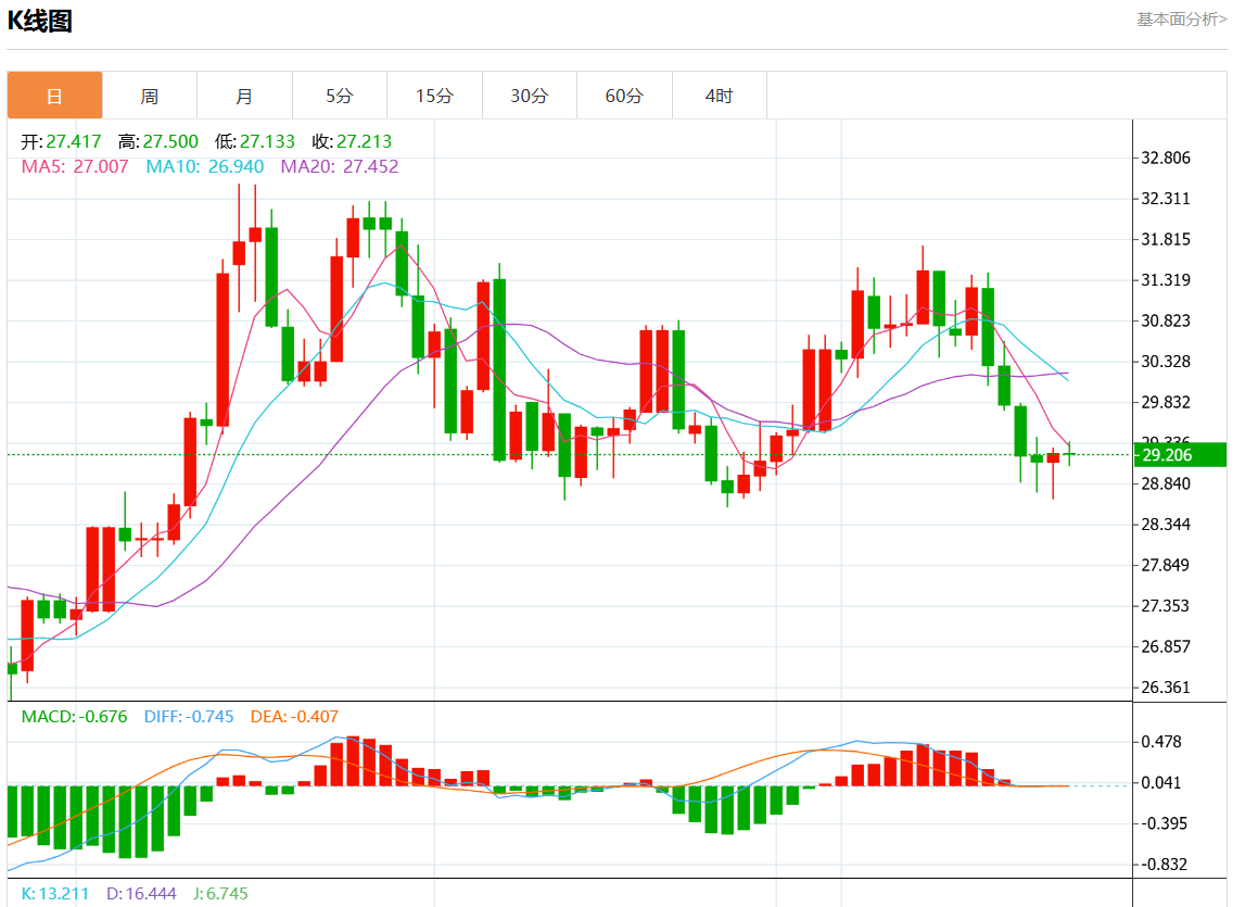 周三欧市盘中,现货白银报29.214,跌幅0.01%。