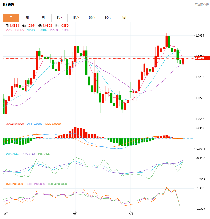 交易策略:可以在1.0865---1.0820的区间上限卖出,有效破位25个点止损,目标在区间的下限。