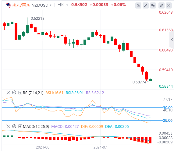 纽元方面,市场对纽储行将在8月份下调其关键官方现金利率(OCR)的押注不断上升,这对纽元构成了压力。此外,由于中国是新西兰的主要贸易伙伴,市场担忧中国经济放缓继续打压纽元。