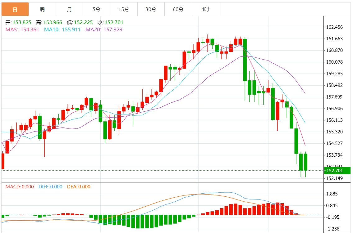 今天的预期交易区间在152.90支撑位和154.50阻力位之间