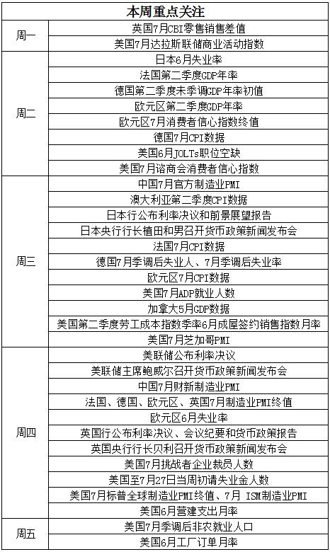本周国际现货黄金开市小幅跳空高开,开市价为2395.79美元/盎司,现时报价在2393附近,在上周末,中东地缘政治局势恶化,以色列称黎巴嫩向戈兰高地发射火箭弹,而本周将迎来两大重要事件,分别是美联储利率决议以及美国非农就业数据,这两个无疑都会给黄金价格带来冲击,市场普遍认为美联储在9月前都会维持利率不变,同时基本认定美联储9月降息预期,除了这两个重磅消息,还需关注日本和英国利率决议,以及美国6月JOLTs职位空缺、美国7月咨商会消费者信心指数、美国7月ADP就业数据、制造业PMI等经济数据,并且留意美联储利率决议公布后,美联储主席鲍威尔在新闻发布会的讲话。