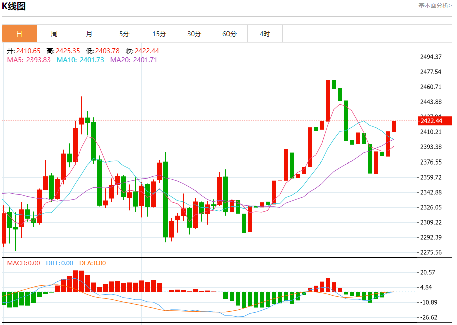 技术点评:在2401.00之上,为多头信号,向上的目标位为2430.00。