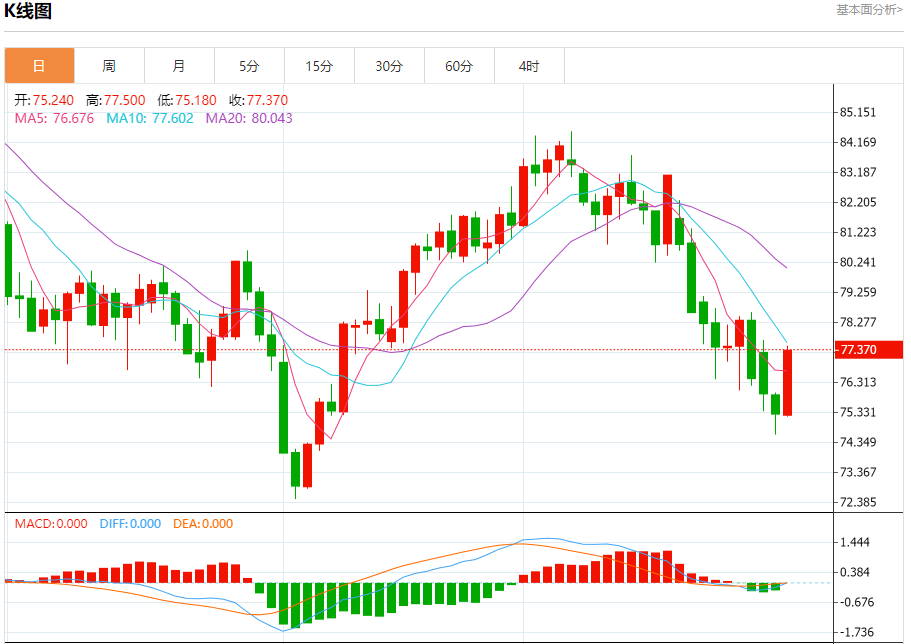 周三盘中,WTI原油报77.350,涨幅3.52%。