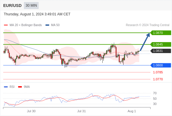交易策略: 在 1.0800 之上,看涨,目标价位为 1.0845 ,然后为 1.0870 。