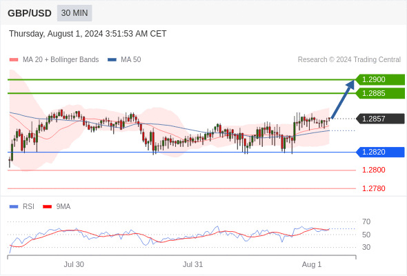 交易策略: 在 1.2820 之上,看涨,目标价位为 1.2885 ,然后为 1.2900 。