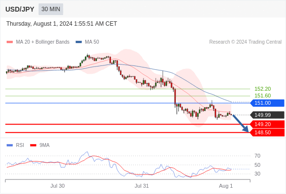 交易策略: 在 151.00 之下,看跌,目标价位为 149.20 ,然后为 148.50 。