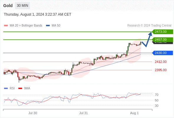 交易策略: 在 2430.00 之上,看涨,目标价位为 2457.00 ,然后为 2473.00 。