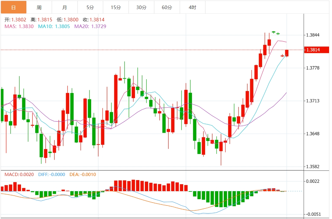 技术上,美元/加元(USD/CAD)在近20个交易日中首次出现坚决下行K线,回落至1.3800关口,因美元兑加元连续看涨,拖累该货币对自下而上上涨了整整2%。美元兑加元的反弹将该货币对拖入 2024 年的新高,测试了去年 11 月出现的价格水平。