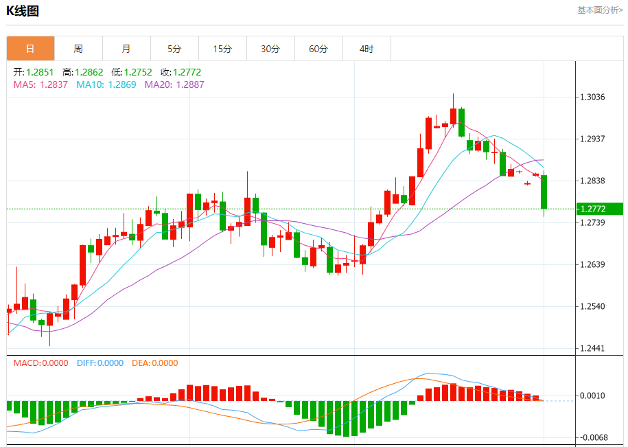 汇价高见1.2862,低见1.2752。上一交易日,汇价收于1.2854。