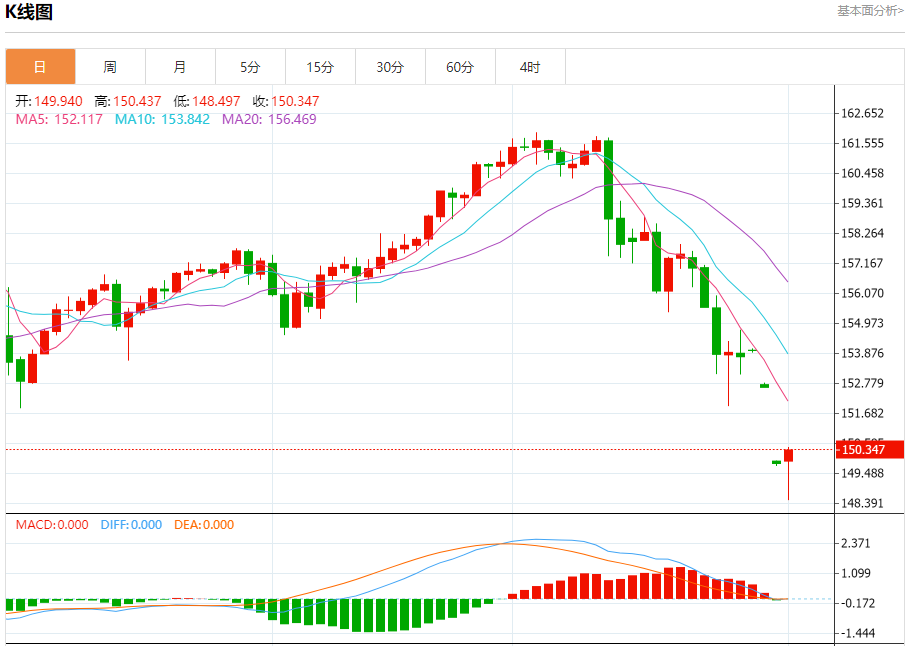 汇价高见150.437,低见148.497。上一交易日,汇价收于149.948。