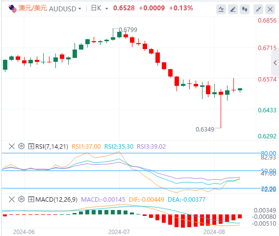 澳元/美元跌破0.65美元手柄可能预示着跌至0.64582美元的支撑位。澳元的14周期每日RSI读数为38.16,可能会跌破0.64582美元的支撑位,然后进入超卖区域。
