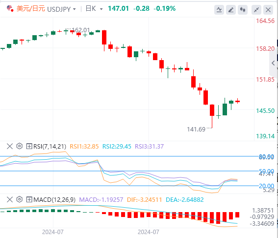 今天的预期交易区间在146.50支撑位和148.53阻力位之间