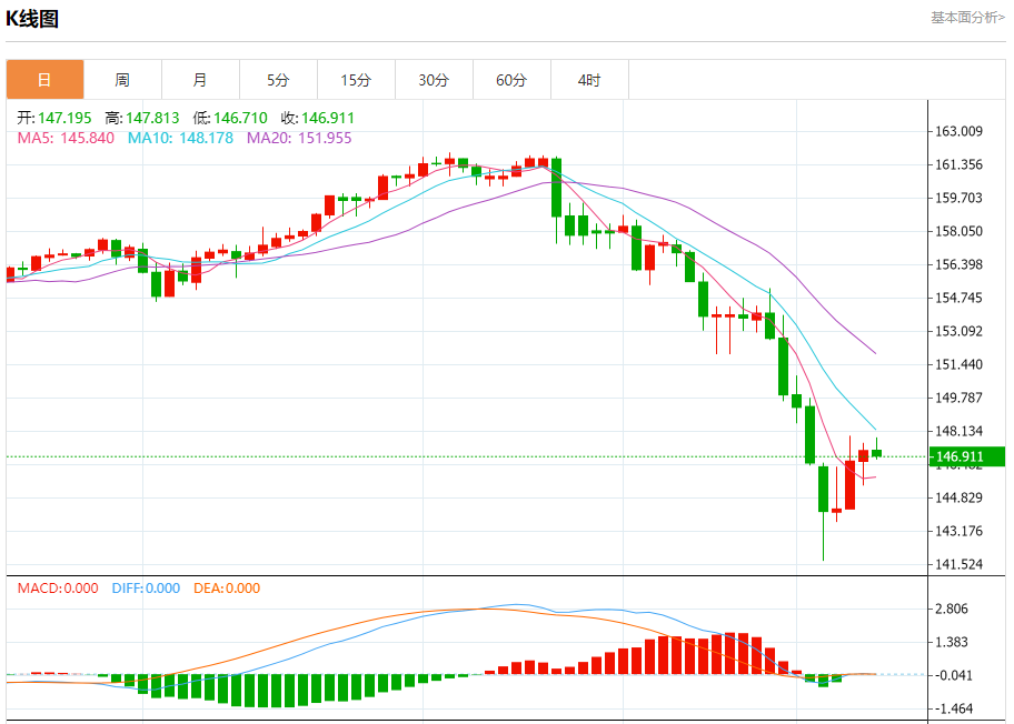 汇价高见147.804,低见146.708。上一交易日,汇价收于147.181。