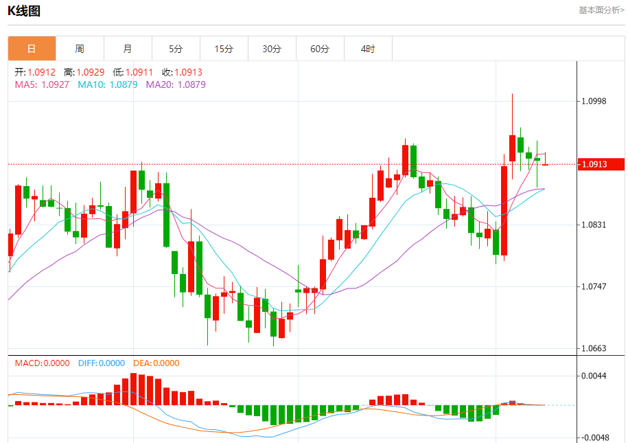 汇价高见1.0928,低见1.0911。上一交易日,汇价收于1.0918。