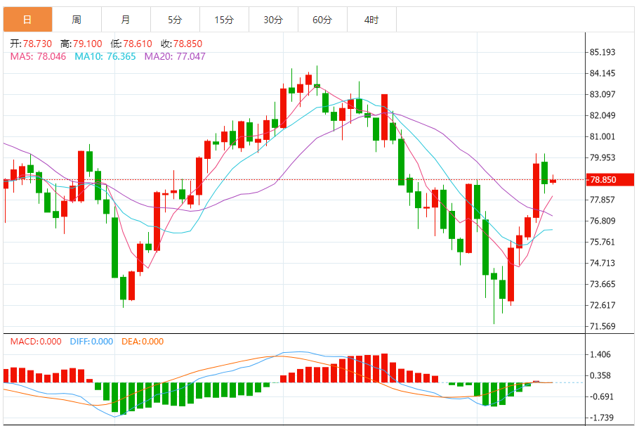 今天的预期交易区间:在77.50美元支撑位和80.50美元阻力位之间