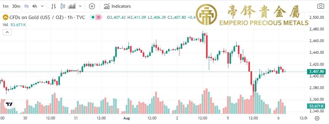 週一金价走势巨幅震蕩,早段开市先下滑,之后反弹至最高2458,中段再次下跌,尾段跌势加剧,最低曾跌至2364,由高点下挫几乎100美元,不过收市重回2400附近。昨日环球股市遭遇重创,纷纷出现暴跌,而金价虽作为传统避险资产,但在抛售浪潮之下一度也未能倖免